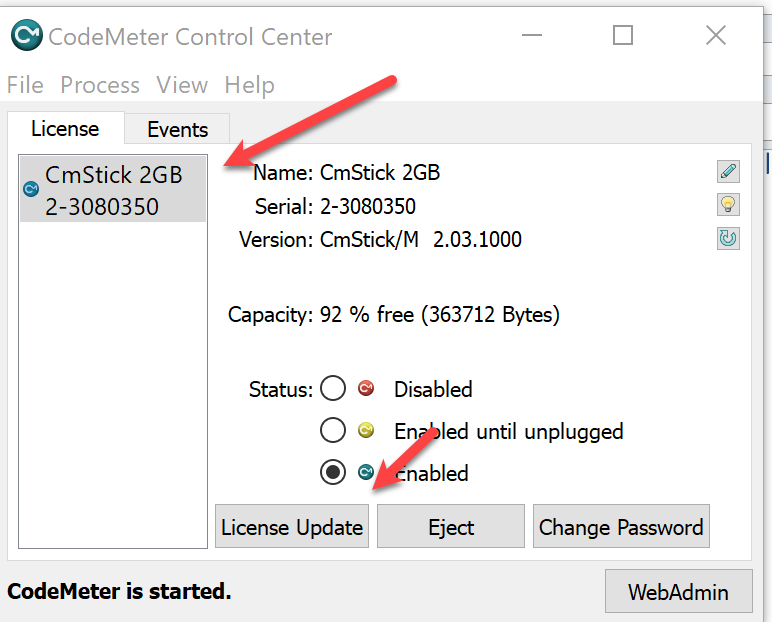 CodeMeter Control Center can be launched from KillDisk Help menu, or from Windows Start menu. You can see all CodeMeter dongles attached, see realated licenses and update the license: